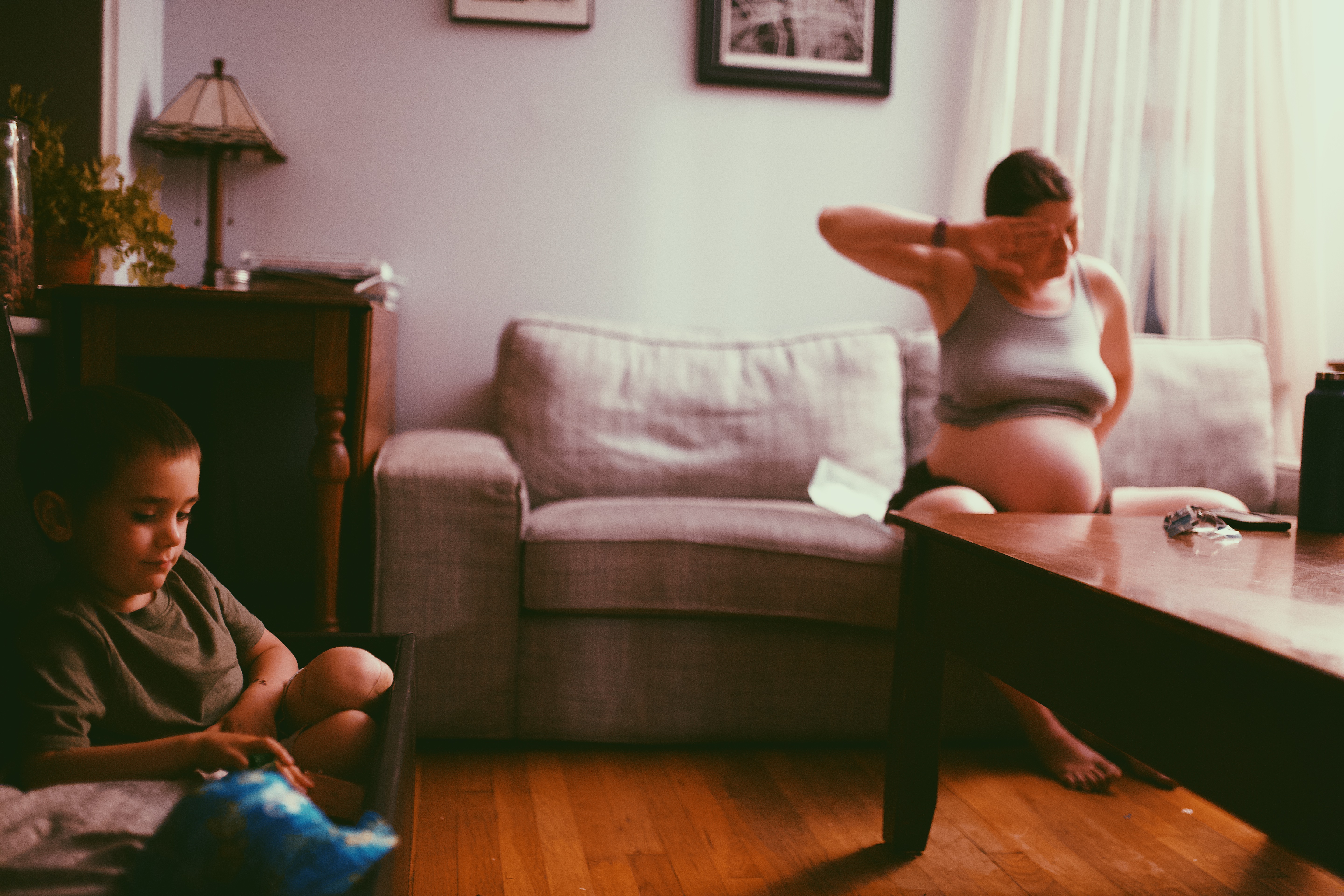 During all of this, Chad was running around getting things done and taking care of the kids, with Laurel in a sling on his chest as she requested (he’s a nice guy, I would have put her on my back so fast 😂), but I, back in the living room, was quickly starting to realize that I really needed Chad’s support and asked him to pass Laurel off to Marilyn, who had also recently arrived. Funnily enough, the guy we had been worrying about how he would handle labor was Everett, but he was taking everything in stride and hanging in there like a champ! (In his hassock cocoon!) Laurel on the other hand seemed overwhelmed, exhausted, and in need of her Daddy, so the hand off from Daddy to Nonna was sad and tear-filled, but I was buried so deep in my own experience, that I could do nothing more than mentally acknowledge what was going on and then let it go. Not to mention, I knew that she was in good hands and would soon be okay (which was 100% the case!) At 4:36 AM, still sitting in the living room on my chux pad, I got a text from Elaine, the doula, saying “All packed up and about ready to take off, stopping for a coffee first. That puts me there in about 15-20 min. Just checking that it still feels progressive and ok to join?” To which I replied “Contractions are 1-2 minutes apart…” And she said “Ok. I’m gonna skip the coffee! 🤣 Headed over.” Somehow, amidst the intense contractions, I had the wherewithal to let her know that we had coffee here, ha!