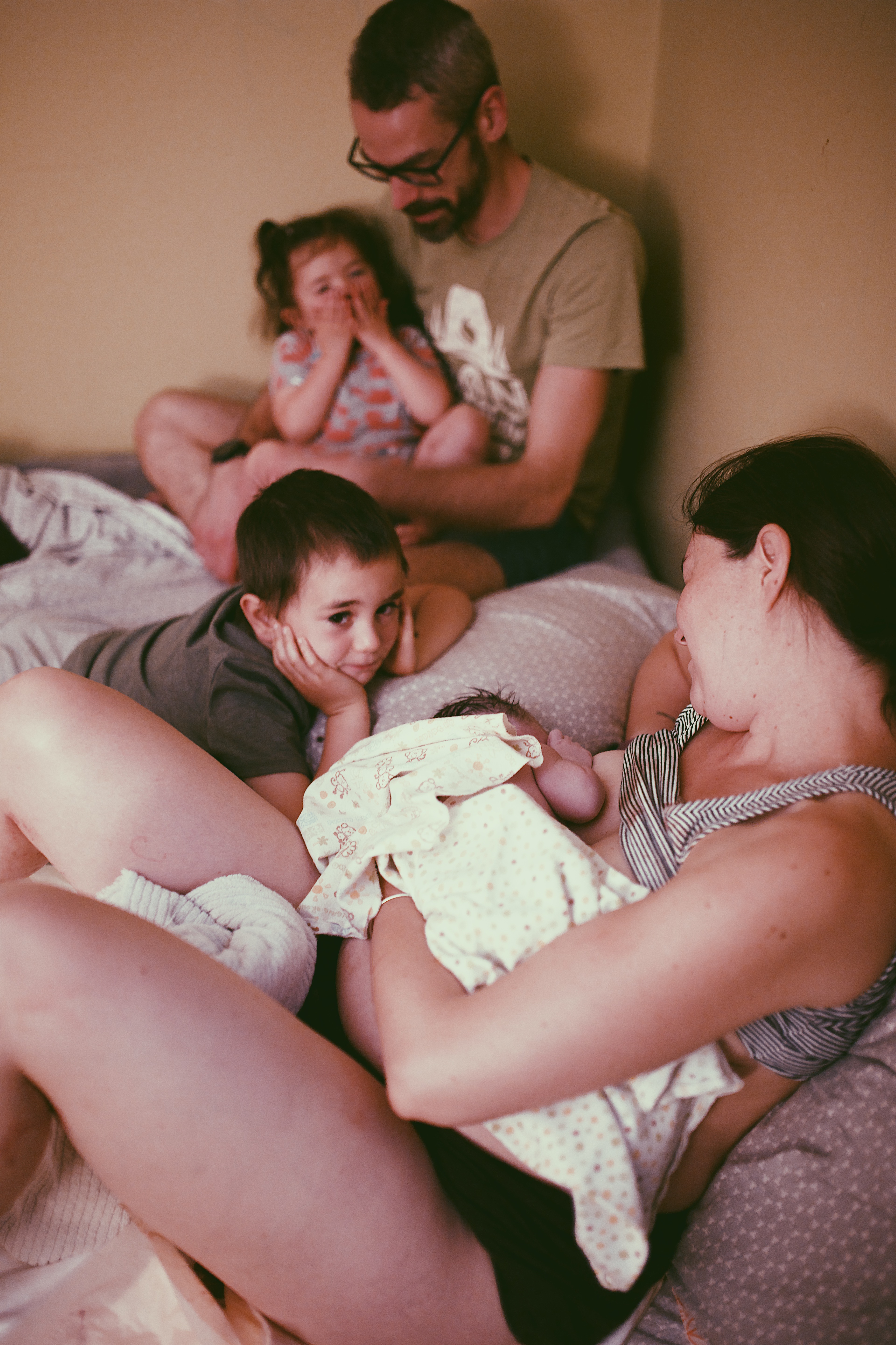 Around 5:00 AM, with everyone assembled, I was still laboring in the living room when I had a contraction during which instead of letting out a groan, a kind of grunt escaped from me, and I thought “Oh shit, here we go!” Tanya said, “Well, that sounded pushy.” And a decision was made to head back to the birth room.” Chux pads were scattered liberally over the bed and under where I was standing and the midwives checked the baby’s heart rate again, which sounded good. With each contraction, I was leaking fluids and getting into the head space that I was about to push a human out of my vagina (which is no small mindset to achieve!) I stood at the edge of the bed, leaning against poor Chad during each contraction. Originally he was standing, but there was no way he could bear the weight of me leaning hard into him for each contraction, so he eventually got down on his knees for better leverage. I eventually started leaning on the bed with my knees, and the midwives were giving suggestions for positions that might be comfortable for me, but I was in that place where no position was going to feel comfortable, and was wracked with the overwhelming indecision of terrible discomfort no matter my placement. Tanya checked the baby’s progress and let us know that the head was only 2 knuckles deep…a minute or two later, one knuckle deep. Tanya asked Chad if he wanted to see the head, and sure enough there it was! Tanya commented on the amount of hair and how the baby followed suit with its siblings. During this whole process of pushing, I can hear Marilyn reading about dinosaurs to the kids on the sofa in the living room. Laurel was apparently nestled up close to her brother, looking to him for comfort, as she does anytime she feels herself out of her element or insecure, which is one of those things that, as a parent, makes your heart swell with joy.