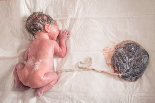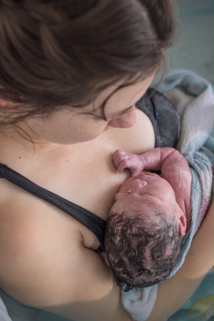 After one intense contraction I felt the baby’s body completely rotate and drop. With the next contraction baby was crowning and one or two contractions later his head was born. The cord was wrapped around his body some so my midwife assisted and with the next urge I caught my baby and brought him to my chest.