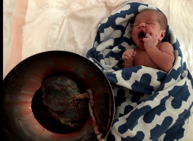 I ended up texting my friend Stephanie, as I still hadn’t birthed the placenta. She came over right away and gave me the encouragement to tug on the cord of the placenta to help it along. About an hour after birth, the placenta came down and out.